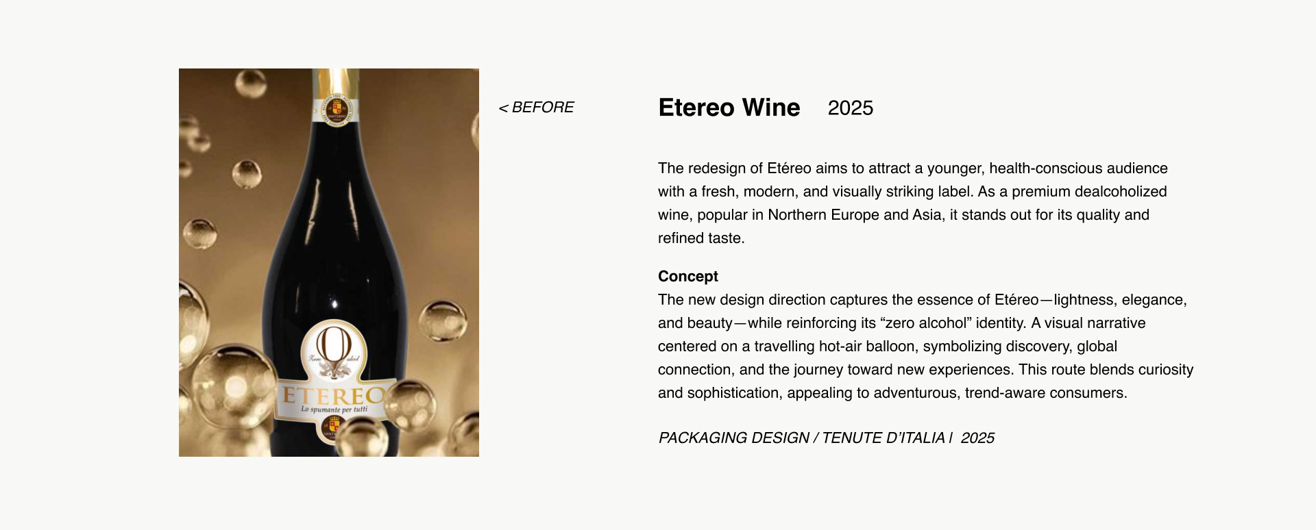The new design direction captures the essence of Etéreo—lightness, elegance, and beauty—while reinforcing its “zero alcohol” identity. A visual narrative centered on the original travelling hot-air balloon, symbolizing discovery, global connection, and the journey toward new experiences. This route blends curiosity and sophistication, appealing to adventurous, trend-aware consumers.